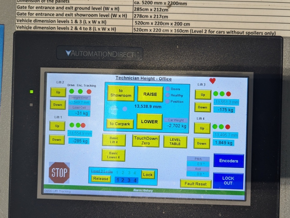Vehicles can be moved in or out of the storage tower either at ground level or at the first floor showroom level. Desired vehicle movements are selected on an HMI screen with the system then automatically performing the selected movement to place a vehicle into one of the 30 storage locations, or to collect a car from a storage location and deliver it to the showroom or ground level car park.