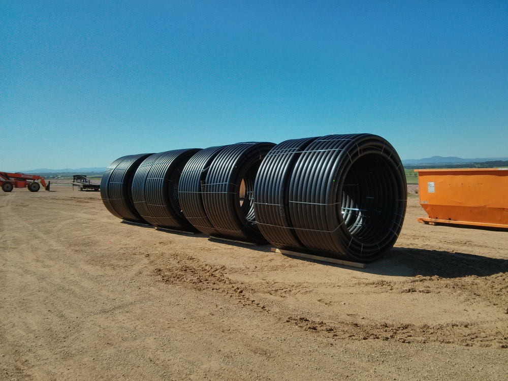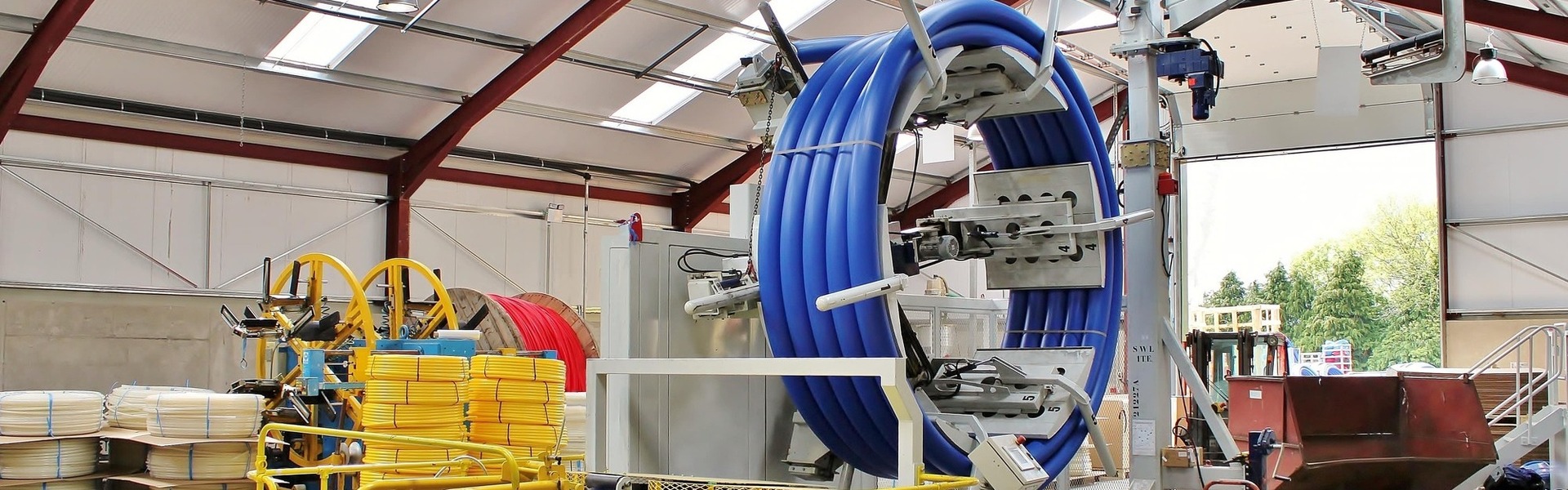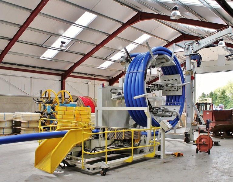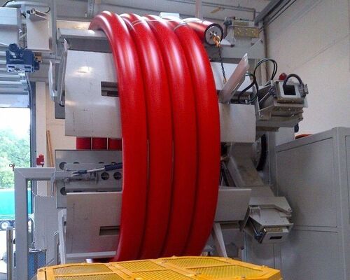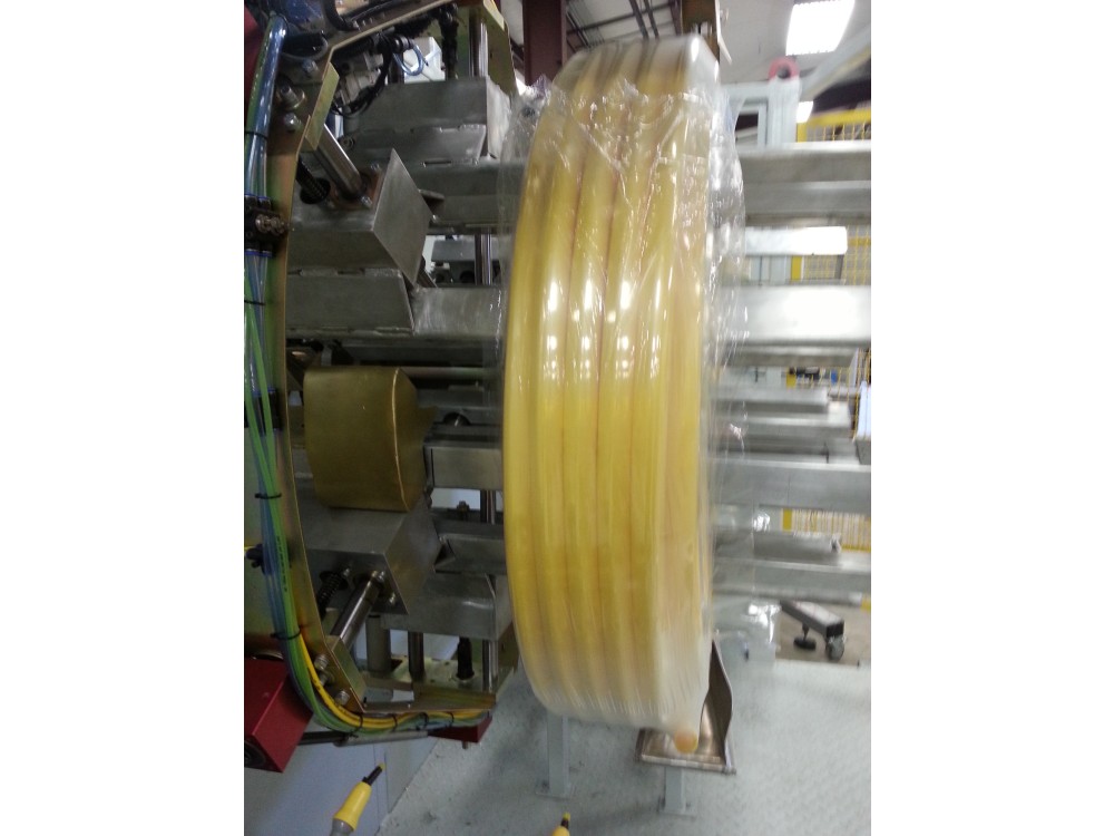 We provide semiautomatic or automatic coiling solutions for HDPE sizes within the range 16mm to 250mm diameter. Automatic machines take pipe directly from the extrusion line, form it into the desired coil shape and apply restraining packaging, such as PET straps or stretch film wrap, before unloading the completed coil. Semiautomatic machines also coil pipe directly at the end of the extrusion line, however they require an operator to perform a number of functions such as connecting the pipe end to the coiler, applying packaging and initiating or performing coil unloading.