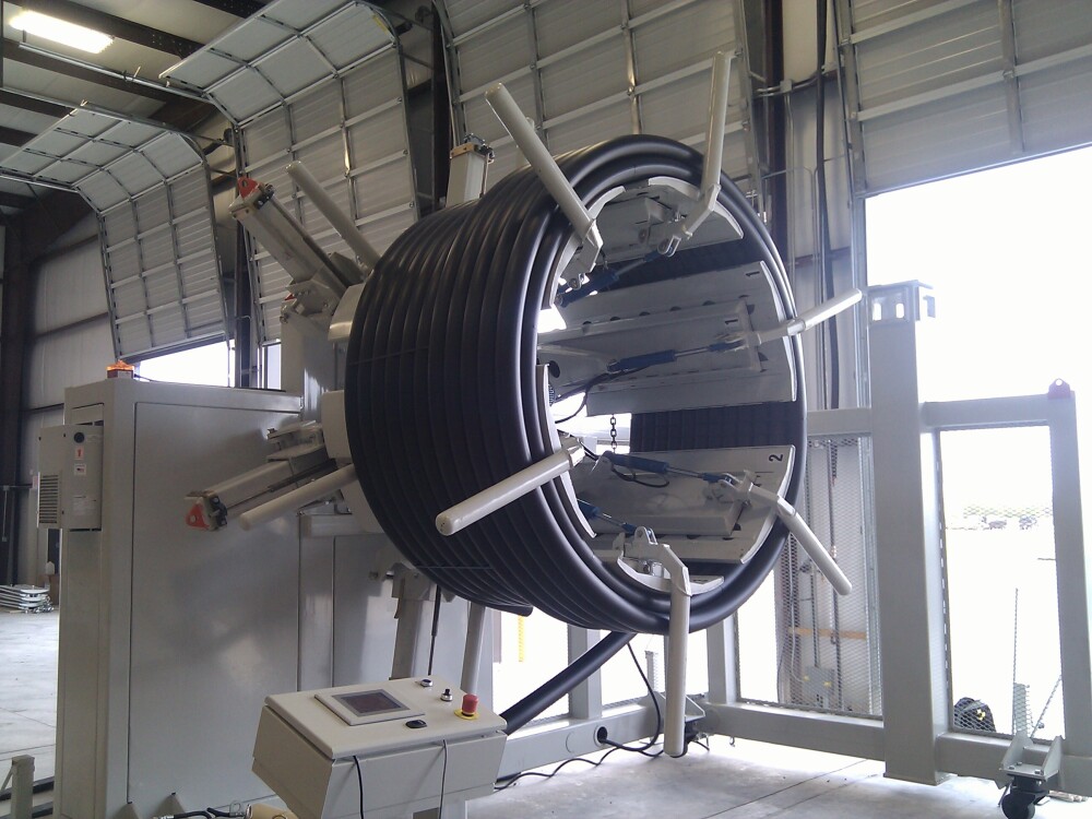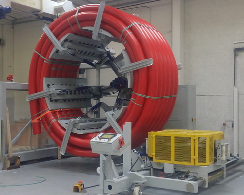 Semiautomatic coiling equipment for 63mm to 180mm HDPE pipe.