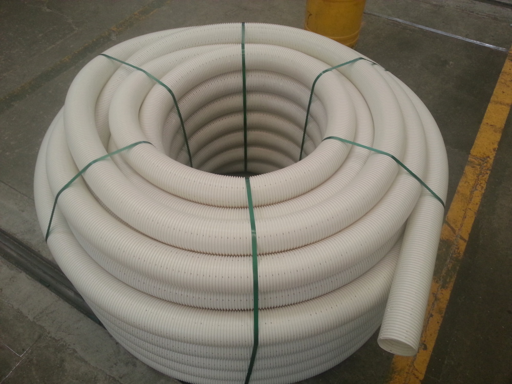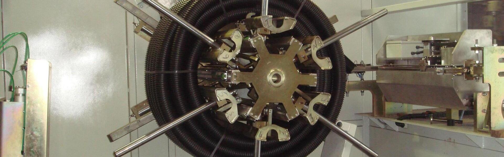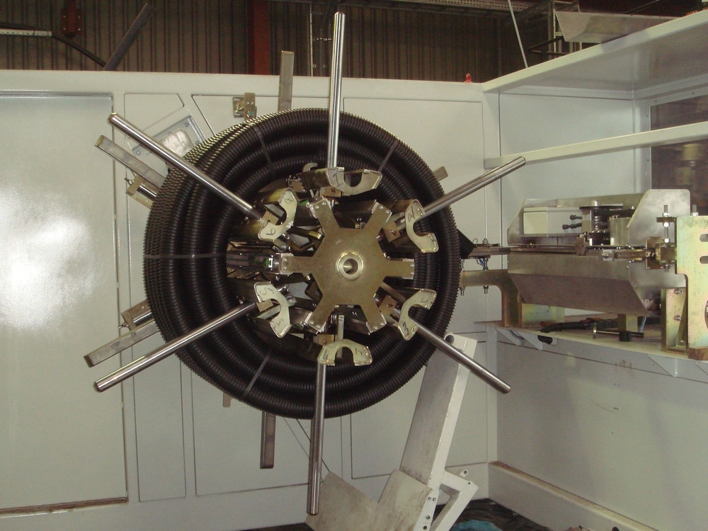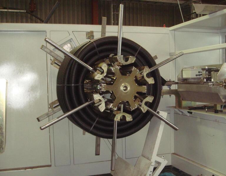 These fully automatic coiling machines for corrugated pipe are available in single or twin head versions. These machines cut the pipe to the desired coil length, apply PP strap packaging and eject completed coils.