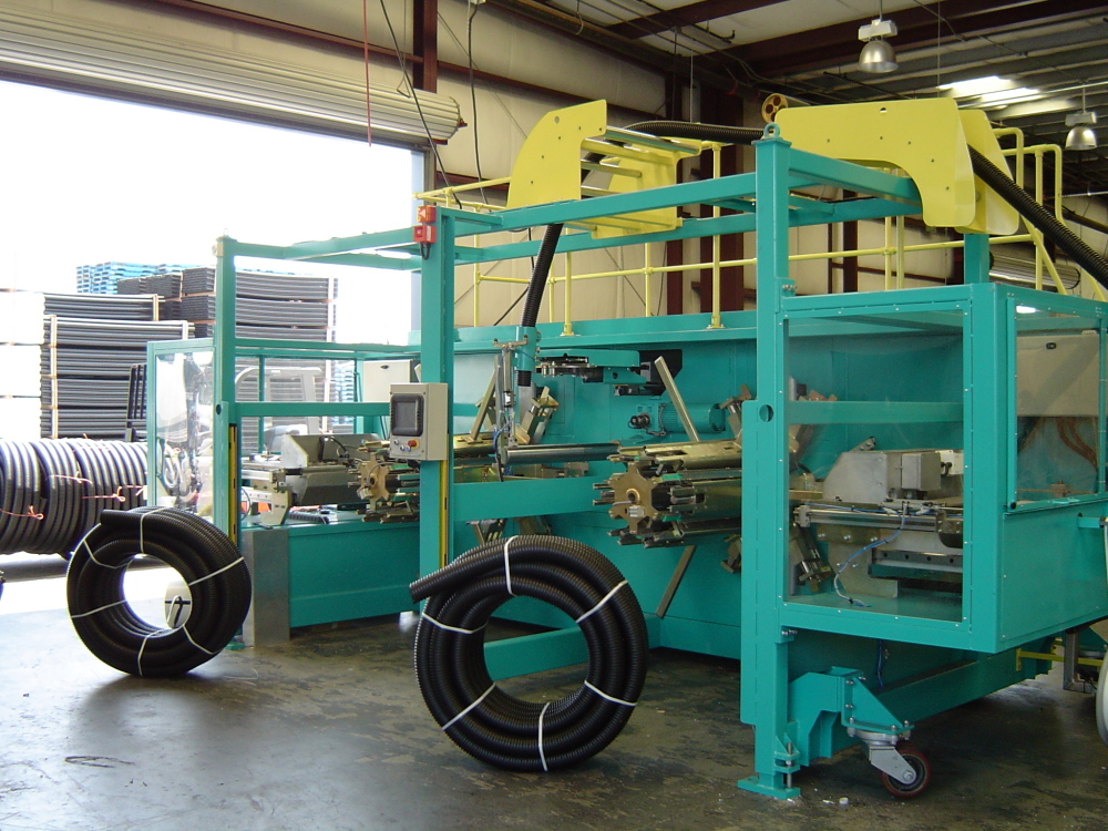These machines automatically cut pipe to the desired length and apply restraining straps prior to ejecting completed coils.